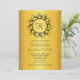 Um monograma de rico em um fundo de ouro ilustrado decora este elegante convite de casamento.