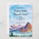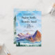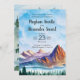 Montanhas com água e pinheiros em aquarela no fundo do convite e um belo céu azul. Você pode editar todos os detalhes do texto. A parte de trás do cartão tem uma floresta de pinheiros próxima.