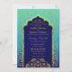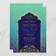 Bollywood ou Arabian Nights teme o convite de casamento em azul real, chá e aqua ombre com sotaques de folha de ouro.