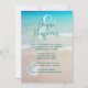 Dólar de areia na praia, convite de casamento com nomes do casal no topo. Um grande e guarda os nomes com uma cena calma de praia como fundo. Um dólar de areia branca solteiro na parte inferior com texto azul para todas as informações de convite. Se necessário, incluir o endereço de recepção e as informações de resposta.