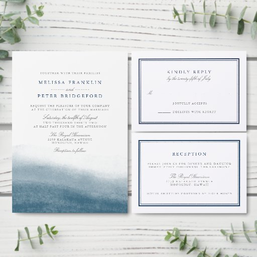 Perfeito para uma praia ou um casamento de verão, nossos convites para o casamento das Marés do Oceano têm uma praia, uma sensação costeira sutil e subestimada. Design apresenta um gradiente de aquarela no fundo, em azul-oceano temperado, com uma curva graciosa que evoca o bordo e o fluxo do mar. Bloqueio elegante e anotações em cinzas suaves e azul marinho correspondente completam a aparência. Cartões invertendo para cinzas sutis e listras brancas. Precisa de ajuda com o convite de casamento ou a personalização? Entre em contato comigo através do link "Perguntar a este Designer" nesta página.