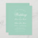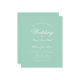 Um simples convite para casamento de orçamento minimalista. Tem apenas texto branco sobre fundo verde-menta. A palavra Casamento e os nomes são escritos em um roteiro caligráfico elegante.