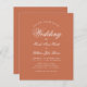 Um simples convite para casamento de orçamento minimalista. Tem apenas um texto branco sobre fundo de terracota. A palavra Casamento e os nomes são escritos em um roteiro caligráfico elegante. Terracotta é um castanho avermelhado, uma cor moderna, natural e terrestre.