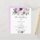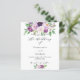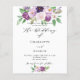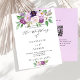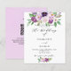 Frente: fundo branco. Decorado com flores violetas e púrpuras de cor aquosa e verde. Personalize e adicione seus nomes e detalhes da festa. Traseiro: cor de fundo rosa. Adicione o URL do seu site de casamento ao código QR para obter detalhes e/ou RSVP. 1 folha = 1 convite impresso de ponta a ponta.