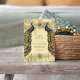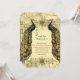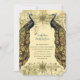 Este adorável convite para o casamento de ornamentado apresenta papel de parede chevron desbotado e pavões lindos e vintage em ouro e azul. Música em segundo plano. Charme do Velho Mundo. Mostrado em papel luxo metálico.