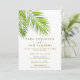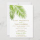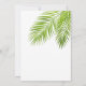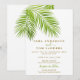 Design de convite: Este convite de casamento exumenta uma vibração tropical serena e elegante com um design limpo e minimalista. No coração do convite, aparece uma solteiro, delicada folha de palma, suas longas e delgadas frondes renderizadas em tons verdes suaves e silenciados. A palma está posicionada em um lado do cartão, criando uma sutil assimetria que adiciona interesse visual enquanto mantém um equilíbrio pacífico. O fundo é branco nítido, permitindo que a simplicidade do design da palma se destaque sem distração.