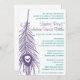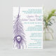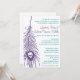 Convite de casamento com pena de pavão roxo e escrevendo de tartaruga, há um RSVP para combinar