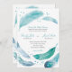 Um convite de casamento elegante apresenta ilustrações de cor d'água de penas azuis.