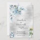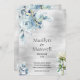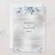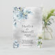 Um convite de casamento, pintado por uma aquarela moderna e elegante, com um buquê de florescências de peônias azuis empoeiradas contra um fundo de lavagem a aquarela prateada com uma serifa viva e fina.