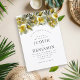 A plumeria amarela floresce o convite para o casamento. Redação moderna, com texto curvo no topo e impressão em maiúsculas para texto de convite. Os primeiros nomes da noiva e do noivo são impressos em letras grandes para se destacarem em cartões brancos com uma grande fronteira floral havaiana no topo. O reverso tem um padrão de cor clara.