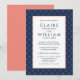 Misturando elementos modernos e tradicionais, nosso convite de casamento Dot de Diamond apresenta detalhes delicados e sutis em uma paleta colorida de coral e marinho. Um padrão de fundo de diamantes brancos pontilhados em quadros clássicos de azul e branco e marinho em seus detalhes de casamento em uma mistura de blocos modernos e tipos tradicionais de script. Uma fina borda branca em coral vibrante, de verão adiciona um pop inesperado de cor contrastante. Cartões à volta de coral sólido.