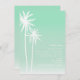 Um convite de casamento para a praia tropical apresentando uma ilustração de duas palmeiras brancas à esquerda sobre um fundo aqua ombre. Personalize o texto branco com detalhes da sua ocasião.