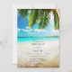 Águas turquesas, areia branca e design de casamento de palmeiras para seu destino tropical ou casamento de praia. O convite é definido numa mistura moderna de fontes de bloqueio e script e impresso a tinta azul escura. Personalize o convite com os detalhes do seu casamento.