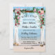 Convite de casamento de praia com uma bonito cena de um porto de rosa e uma vista no oceano. Este convite tem uma placa RSVP correspondente. Bonito para um casamento de praia ou destino.