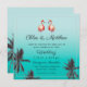 Uma design de praia tropical e brilhante inspirada por uma ilha com águas limpas. As cores de fundo são azul-céu e matizes aqua com flamingos rosa/corais e palmeiras no primeiro plano moldados por uma fina borda elegante de cinzas. Este design moderno é excelente para praia, marina e casamentos de destino. Os tamanhos de papel de convite e as fontes são personalizáveis.