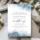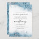 Este elegante convite de casamento apresenta um design de borda azul-clara de cor d'água na imitação de mármore veinado com folha de prata falsa, desaparecendo gradualmente no fundo branco. A palavra "casamento" aparece na escrita manual de cinzas de carvão, com o texto remanescente em maiúsculas de serifas. O padrão de mármore azul e prateado é repetido na parte traseira do cartão.