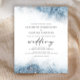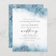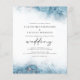 Este elegante convite de casamento apresenta um design de borda azul-clara de cor d'água na imitação de mármore veinado com folha de prata falsa, desaparecendo gradualmente no fundo branco. A palavra "casamento" aparece na escrita manual de cinzas de carvão, com o texto remanescente em maiúsculas de serifas. O padrão de mármore azul e prateado é repetido na parte traseira do cartão.