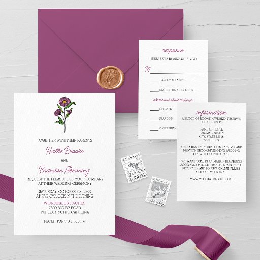 Este elegante Convite para Casamento de Aster Roxo Minimalista é uma bela escolha para um casamento de jardim inspirado na boêmia em setembro. A simples flor roxa de gesso, puxada à mão no topo, adiciona um toque de chorona, enquanto a elegante caligrafia e as fontes tradicionais de serifa fornecem uma sofisticada e eterno para seus detalhes de casamento.