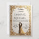 Um convite de casamento luxuoso que inclui um quadro floral de ouro ornamentado, fundo de marfim e uma elegante silhueta de noiva e noivo em ouro misturado. Perfeito para casais que buscam elegância de eterno e um estilo especial de papelaria de casamento.