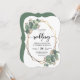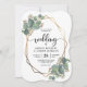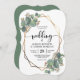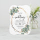Este é um belo convite de casamento com eucalipto e design de moldura geométrica dourada. Inclui-se um fundo correspondente com o padrão das folhas de eucalipto.