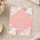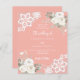 Para um casamento elegante e romântico. Um fundo cor-de-rosa coral decorado com flores, rosas e rendas brancas. Personalize e adicione seus nomes e detalhes. 1 folha = 1 convite impresso de borda a borda.