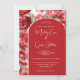 Este convite para o casamento exude elegância e charme, mostrando um fundo vermelho vibrante adormecido com delicados sotaques florais. A borda apresenta um belo conjunto de flores vermelhas e cor-de-água rosa, adicionando um toque de romance e sofisticação ao design. A área de texto é dentro a um arco vermelho vibrante e combina fontes elegantes cursivas e clássicas de serifa, criando um layout harmonioso e visualmente atraente.
