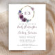 Esta design de casamento apresenta as iniciais da noiva e do monograma do noivo em roxo escuro, enquadradas por uma camada aquosa de flores roxas em um círculo de folhas falsas de ouro. Personalize o texto com os nomes dos casais no elegante roteiro de mão roxo escuro e os detalhes do casamento em cinzas de carvão. O reverso é uma sombra sólida de roxo escuro.