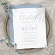 Apresentando nomes de estilo de assinatura, este elegante convite de casamento azul empoeirado para orçamento pode ser personalizado com suas informações em caracteres de chico. Projetado por Thisnotme©