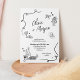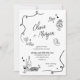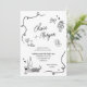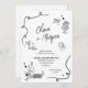 Este convite para o casamento apresenta um design de rabiscos brancos e divertidos, fazer um convite único e divertido. A frente mostra os nomes dos casais em uma fonte moderna, acompanhada de rabiscos desenhados à mão de artigos comemorativos como óculos de vinho, anéis e um bolo. O convite pode ser tornado ainda mais vibrante mudando a cor dos emblemas e do texto do rabisco, acrescentando um toque personalizado a esse charmoso design. Você pode editá-lo clicando no botão "Editar usando a ferramenta design".