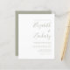 Este simples convite de casamento moderno apresenta texto verde sábio sobre fundo branco. Adicione os nomes da noiva e do noivo na caligrafia de escrita manual do na moda e os detalhes na fonte sans serif. O reverso é uma sombra correspondente de verde de sábio sólido.