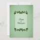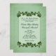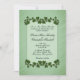 Um belo convite verde com fronteiras de folhas verdes. Coloque os primeiros nomes do casal de um lado com todas as informações do casamento e saudação da mãe e do pai da noiva. Por favor, verifique triplicamente todo o seu texto.