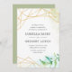 Nossa coleção do Terrarium enquadra seus detalhes de casamento com uma intrincada borda de elementos geométricos dourados acentuados com as folhas botânicas verdes, de cor aquosa, no canto inferior direito. Convites de casamento invertem-se para um padrão de lavagem a aquarela em tons pastéis de azul e verde.