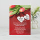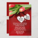 Bonito convite à cerimônia de casamento ou compromisso, com uma bela fotografia de tulipas e corações brancos, num fundo vermelho. Os nomes dos casais estão em preto nos corações brancos, e o texto do convite é feito em branco. Personalize todo o texto frente e verso para um belo convite para o casamento... você vai tesourar uma vida inteira.