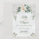 Este convite tem um estilo suave e elegante com uma paleta de cores pastel dominada por tons de verde e branco. No topo, há um belo arranjo de flores brancas e creme, incluindo rosas e outros sangramentos delicados, intercalados com folhas verdes. Os nomes são exibidos no centro com na moda, letra cursiva, com ilustração de anéis de casamento entrelaçados abaixo dos nomes. A design é sofisticada e romântica, adequada para uma celebração de casamento. F002