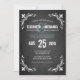 Este adorável convite para casamentos vintage apresenta um fundo de quadro negro, um padrão de canto de filigrana branco e uma tipografia em apuros. Facilmente personalizado on-line com suas informações.