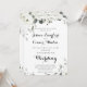 Um elegante convite de casamento todo-branco com uma delicada cor d'água de florais brancos de peônias e eucalipto verde prateado com um roteiro de casamento animado de caligrafia, anunciando seus detalhes de casamento.