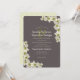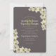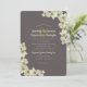 Convites de casamento Dogwood para personalizar linha a linha. As flores brancas de madeira de cão são pintadas com marrom-rosa nas bordas e têm centros verdes brilhantes. As flores em cascata ao longo das bordas superior e inferior. A cor da fumaça escura é o fundo para a inscrição cor-de-rosa pálido em texto curvo moderno e linhas impressas com espaços entre eles. Um homem verde mantém os nomes juntos. O reverso tem um padrão de flores giratórias verde e esbranquiçado divertido.