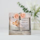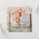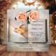 Um convite romântico de casamento com livros com rosas e anéis de casamento com uma camada de praia de sonho. Bonita para um casamento de biblioteca ou um casamento com um tema de livro.