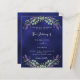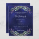 Um fundo azul marinho decorado com flores lavandas e verde de eucalipto. A cor azul é irregular. Personalize e seus nomes e detalhes. 1 folha = 1 convite impresso de borda a borda.