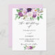 Um fundo branco na frente. Decorado com flores violetas e púrpuras de cor aquosa e verde. Personalize e adicione seus nomes e detalhes da festa. Fundo: fundo rosa. 1 folha = 1 convite impresso de borda a borda.