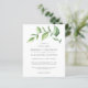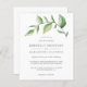 Convite de casamento para orçamento russo com um simples design com uma aquarela verde pintada com folhas grandes, sobre um fundo branco. Abaixo estão os detalhes de seu evento em cinzas suaves. Um convite de casamento botânico elegante que é excelente para um casamento de verão.