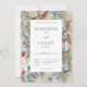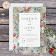 Este design apresenta pinheiro, eucalipto, morangos vermelhos e azuis, e outras folhagem verde, sobre fundo dourado falso com caixa de texto branca. Faz parte do "Winter Christmas Greenery Wedding Suite", conjunto de cartas criado pela "Simply Farmhouse Press".