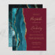 A borda esquerda deste elegante convite de casamento moderno apresenta uma coloração aquosa lacrimogênea aparada com uma falsa brilha de ouro. O texto personalizável combina manuscritos dourados, copperplate e fontes itálicas num fundo vermelho arrojado profundo e rico. O verso apresenta um design de chaleira e de agata dourada.