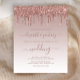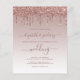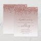 Um design moderno, chic, com um fundo em forma de ouro rosa com uma borda superior de pingos de ouro rosa. A palavra "casamento" e os nomes dos primeiros casais aparecem em letras minúsculas com traços decorativos no início e no fim, com o texto restante na letra sans serif. O fundo do ombre rosa dourado e a borda de gotejamento com brilho são repetidos no sentido inverso. (Para guardar as hastes, substitua apenas as letras, deixando os símbolos no lugar.)
