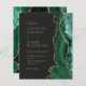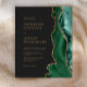 A borda direita deste elegante convite de casamento moderno apresenta uma esmeralda verde aquarela agate borda com falsa brilho dourado. O texto personalizável combina fontes serif, copperplate e itálico de cor dourada em um fundo preto de ardósia. O verso apresenta um design emerald verde e dourado.