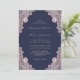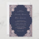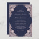 Estes elegantes convites de casamento com rendas florais de rosa de ouro contra um fundo azul marinho são perfeitos para convidar seus convidados para a festa de casamento azul e rosa de ouro rústico.