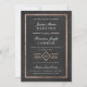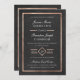Convites de casamento sobre um falso efeito de folha de ouro rosa e texto branco sobre um fundo preto texturizado sutilmente. Script clássico e fontes serif. Um simples efeito de deco de arte na data do casamento. Note-se que a folha de ouro rosa é um efeito impresso - não será utilizada nenhuma folha metálica real no convite.