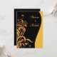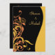 Este é um convite ousado, mas bonito para casamento em preto, ouro e coral. Apresenta um design de espiral floral atraente no lado esquerdo, com uma aresta dourada curvada sobre o fundo preto no lado direito. O nome da noiva e do noivo aparece na frente, com as informações do casamento no fundo preto sólido. Fácil de personalizar! Certifique-se de ver os cartões RSVP e outros produtos de casamento na minha loja.
