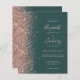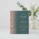 A borda esquerda deste elegante convite de casamento moderno apresenta uma borda falsa de ouro rosa. O texto personalizável combina manuscrito colorido cor branco de rosa pálido, fontes em copperplate e itálico em um fundo verde escuro. O verso apresenta um design verde escuro e rosa dourado correspondente.