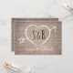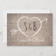 O Convite Elegante Rustic Wooden Heart Invitation apresenta um fundo de efeito de madeira com coração entalhado e design de seta para frente e para trás. Personalize para seus próprios nomes, iniciais, hora do casamento e data.